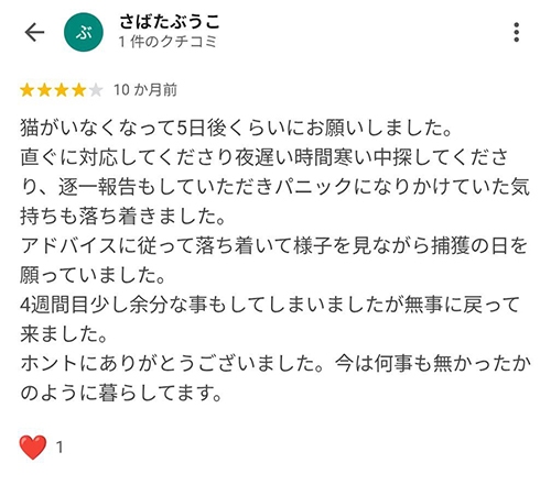ペット捜索のご依頼をいただいたお客様から、たくさんのお喜びの声をいただきましたので一部ご紹介いたします。
